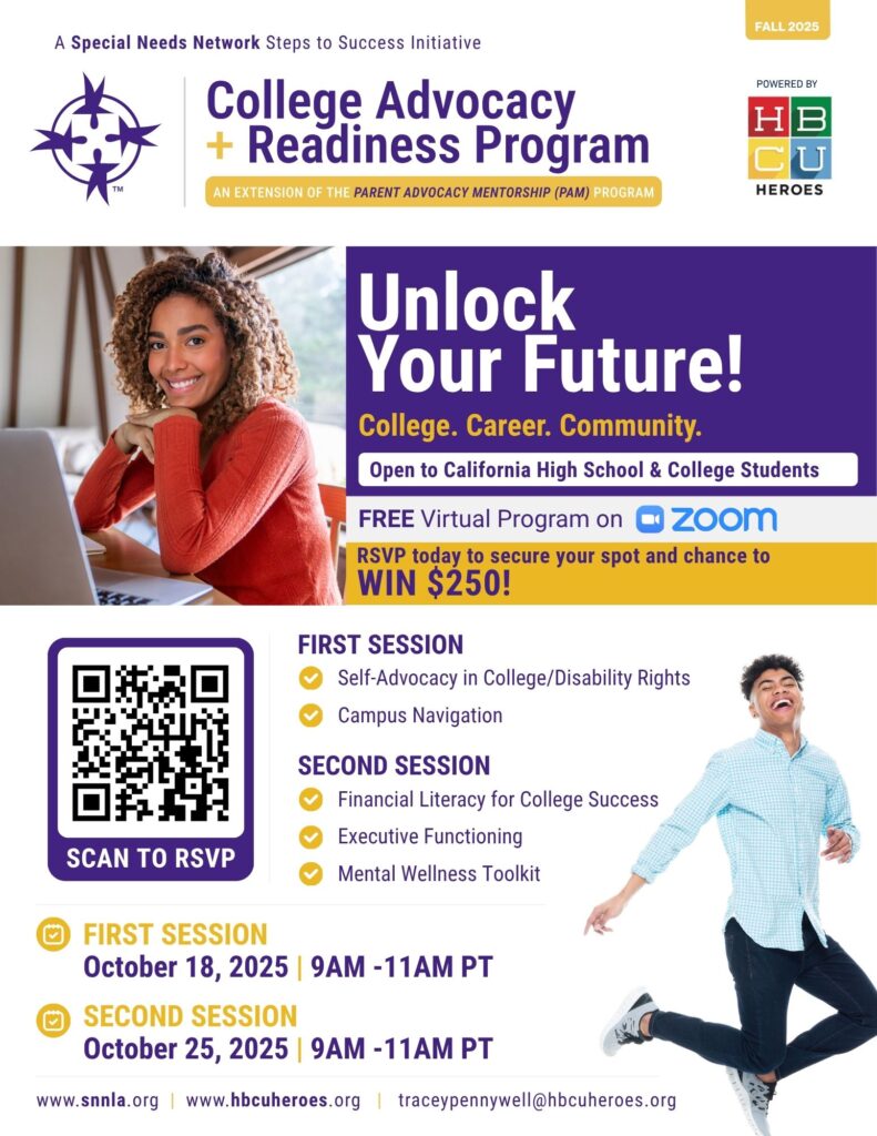 Join us for the Fall 2025 College Advocacy + Readiness Program, a free two-part virtual series designed to empower California high school and college students—especially neurodivergent learners—and their parents. This program equips participants with essential tools for college success, financial literacy, mental wellness, and self-advocacy.